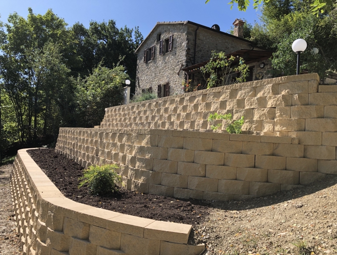 De klus is geklaard; op ons terrein zijn drie muren gebouwd om de boel stabiel te houden. Ons huis bevindt zich op een prachtige plek in de Apennijnen. Wij wonen hoog tegen een heuvelflank, met als gevolg dat ons terrein op de meeste plaatsen tamelijk hellend is. Een van die hellende vlakken, dat jaren geleden was gestabiliseerd met houten palen en planken, was in de loop der tijd gaan verzakken. Er moest dus actie ondernomen worden om te voorkomen dat een groot gedeelte van het terrein vele meters lager zou belanden. Het zal ergens in maart van dit jaar zijn geweest, dat wij de plaatselijke aannemer hebben gevraagd om eens te komen kijken. Tijdens het dorpsfeest op 1 mei kwamen wij hem tegen. Van verre riep hij al dat hij ons niet was vergeten……… Juni was al een eindje op weg toen hij plotseling voor ons stond. En dat kwam doordat de geometra, die wij inmiddels in de arm hadden genomen, hem er fijntjes op had gewezen dat misschien wel een ander bouwbedrijf uit de omgeving tijd zou hebben voor onze klus.